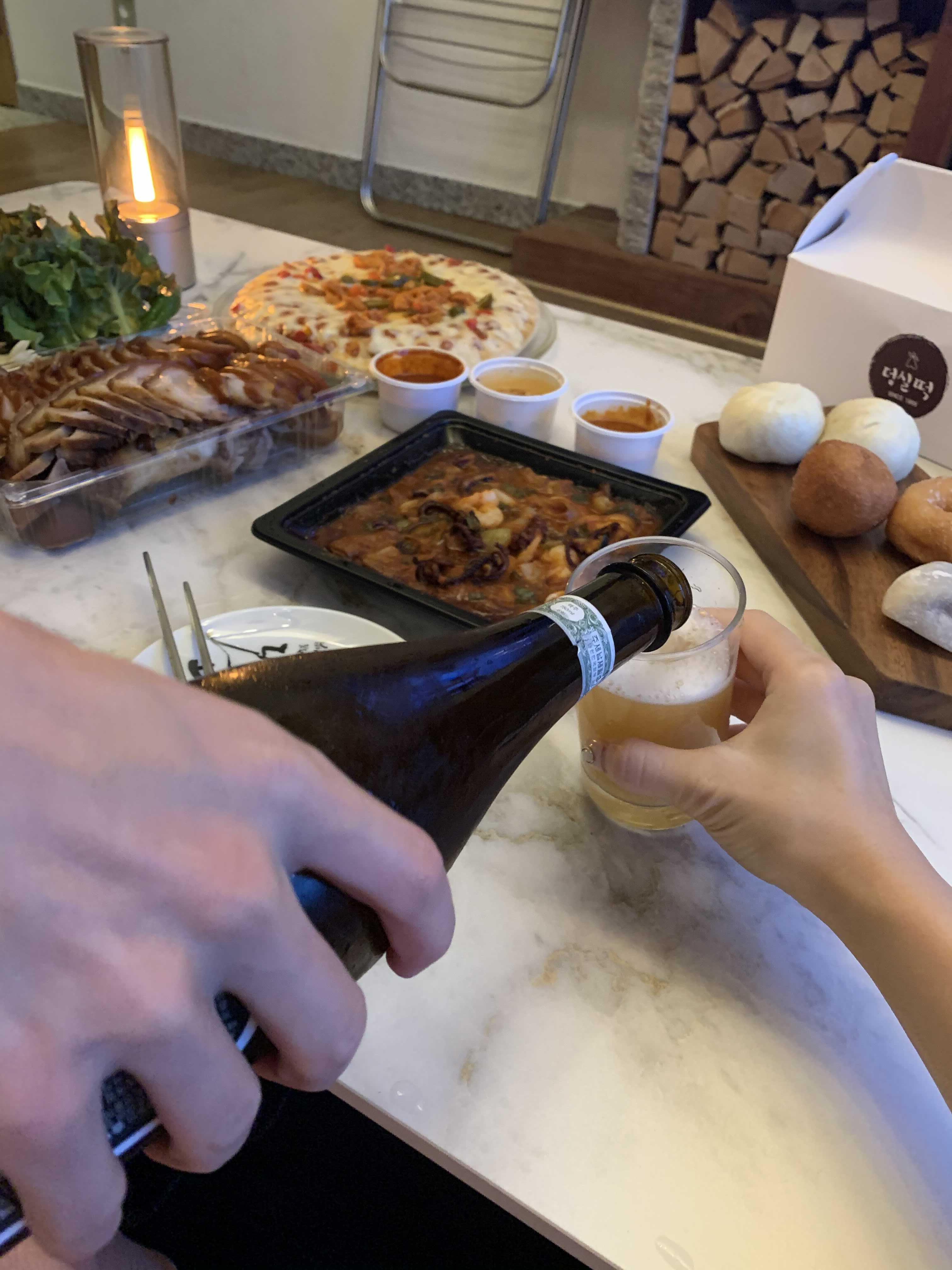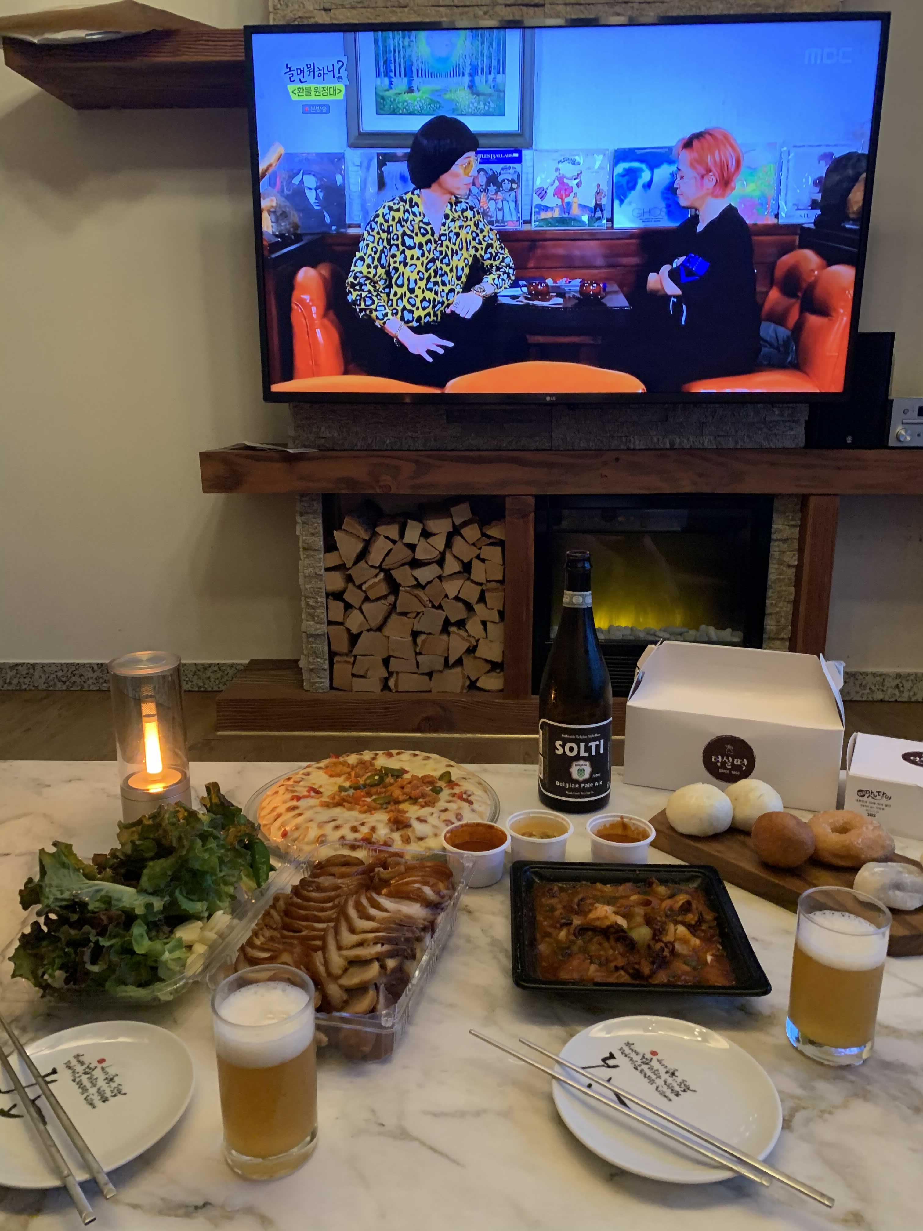 족발이 도착했고, 셋팅 시작합니다. 체크인 할 때 사온 수제맥주🍺(이거 진심 맛있어요)와 제천시장에서 사온 이것저것, 덩실분식에서 사온 찹살떡 도넛을 셋팅하니 뷔페 한상이 차려졌네요.🥳🥳🥳