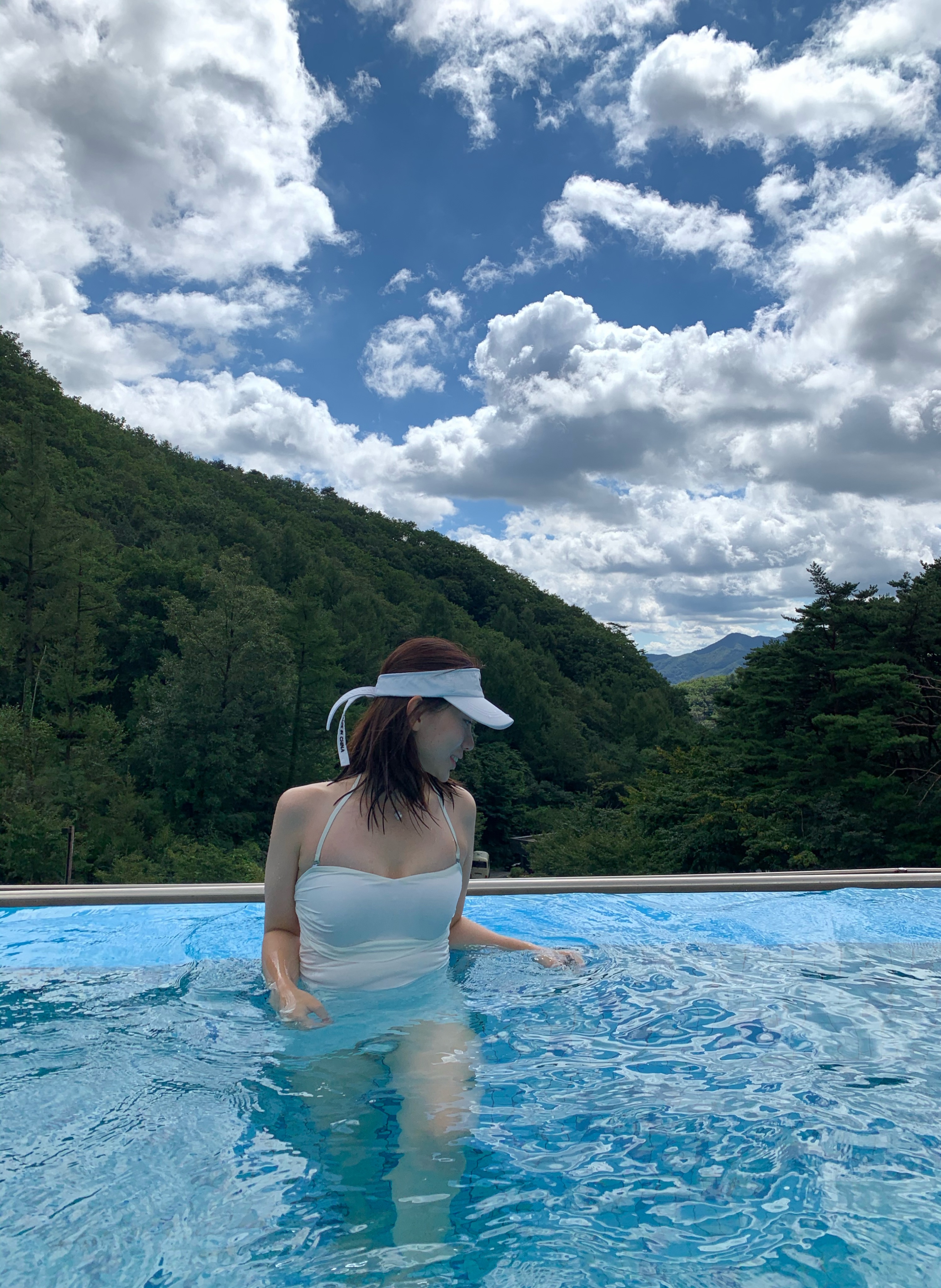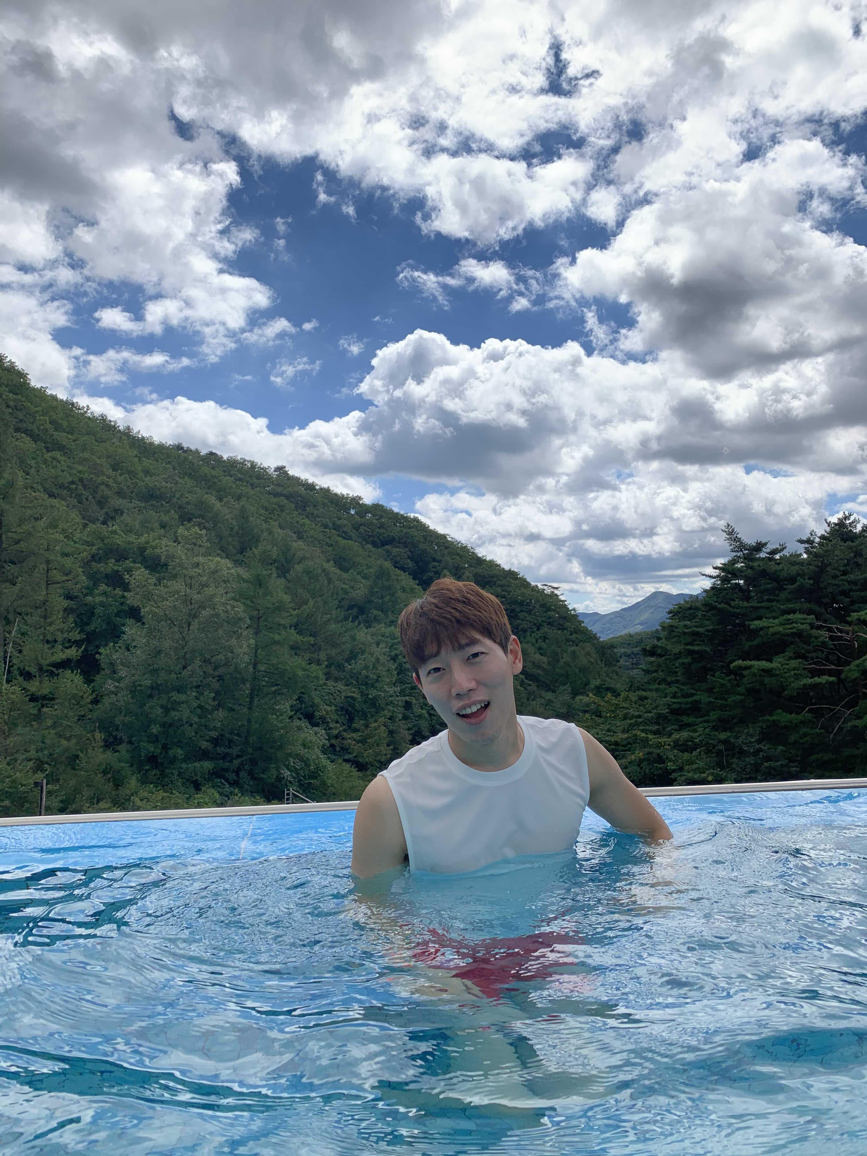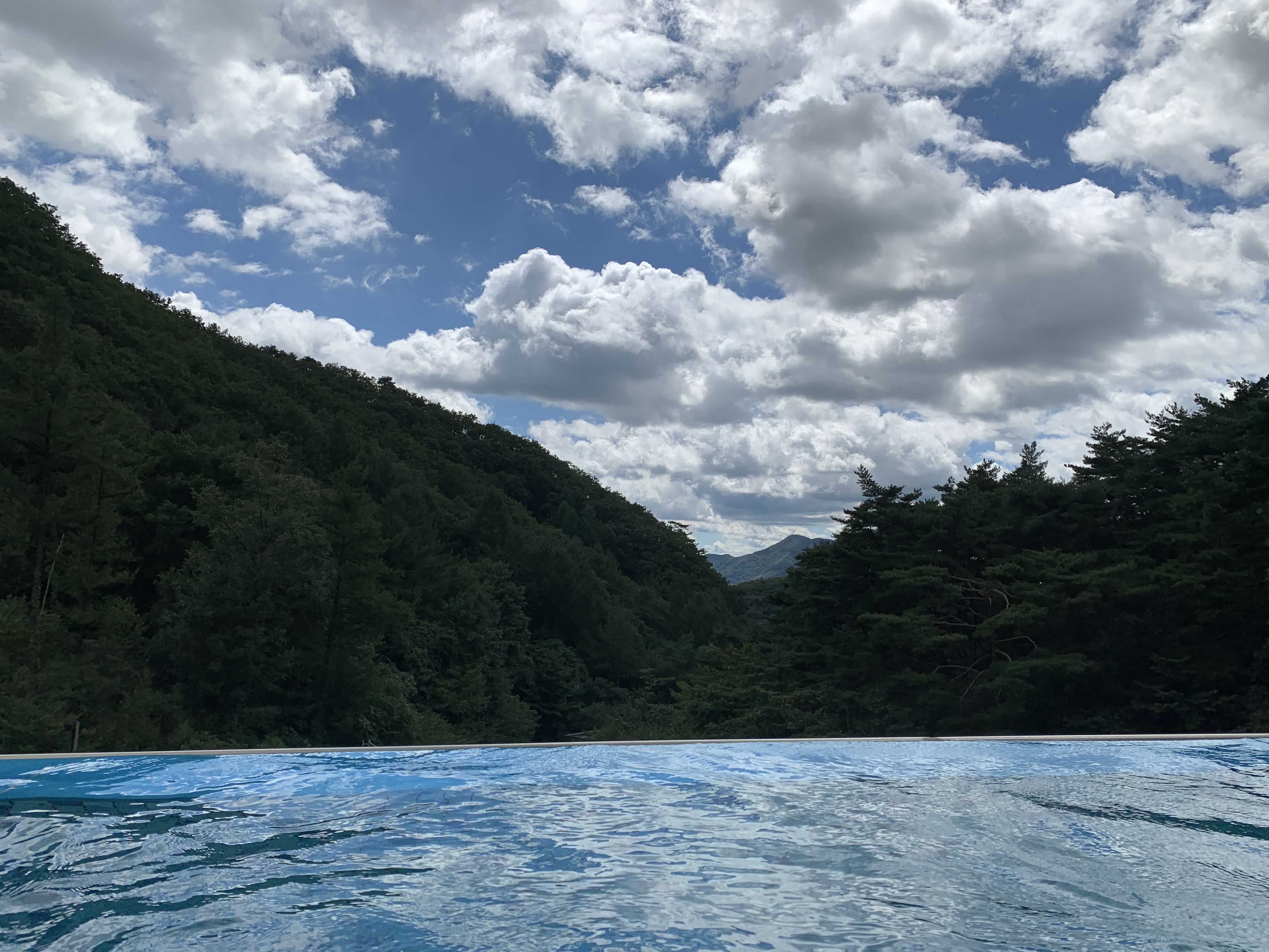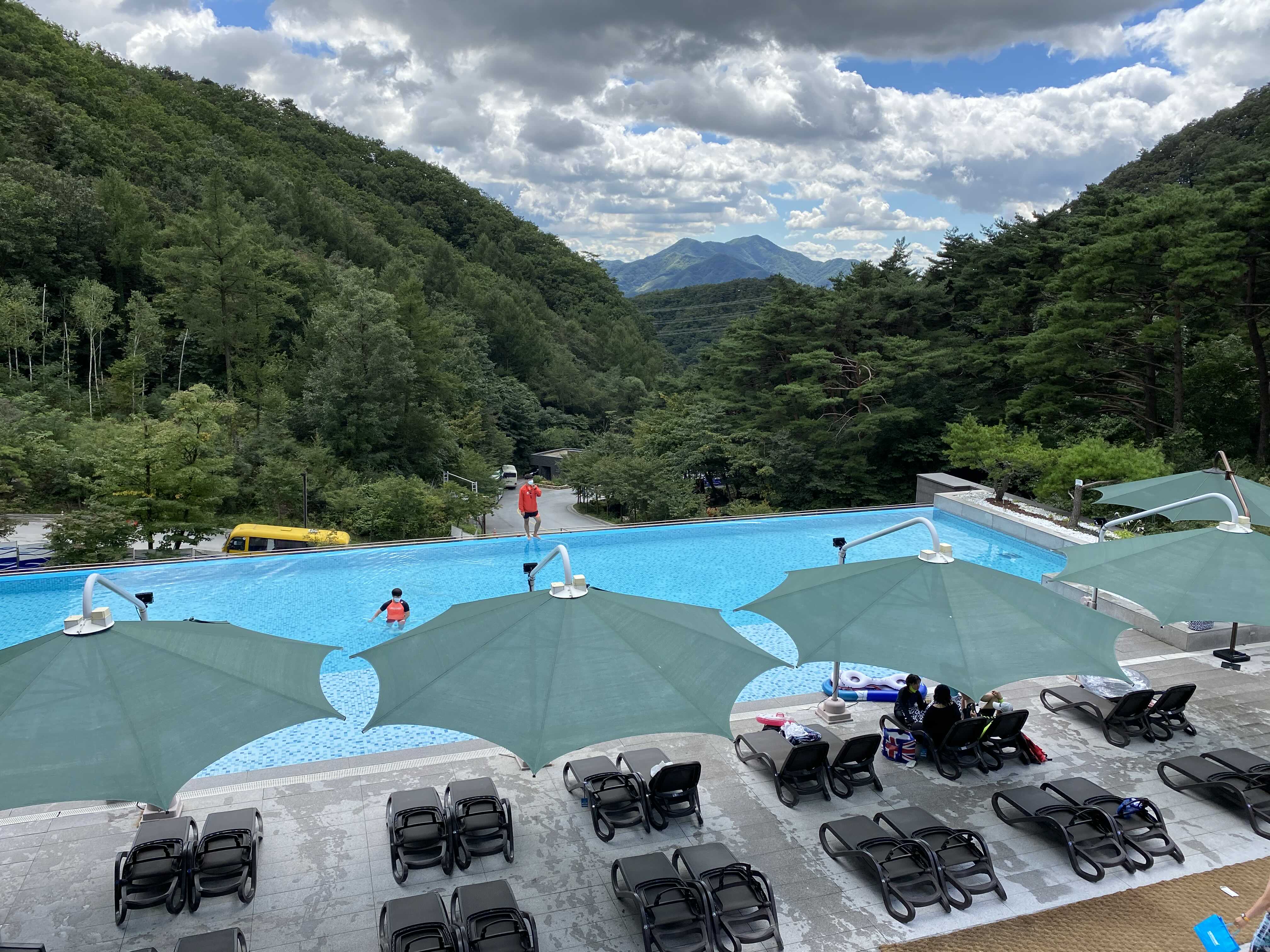 또 다른 리솜포레스트의 명소, 마운틴뷰 인피니풀로 자리를 옮겨서, 풍경을 담았어요. 물 깊이는 성인 가슴높이 정도 되요. 유유히 물놀이 하기에 딱 좋아요. 물 온도도 차지 않고 미온수에요.