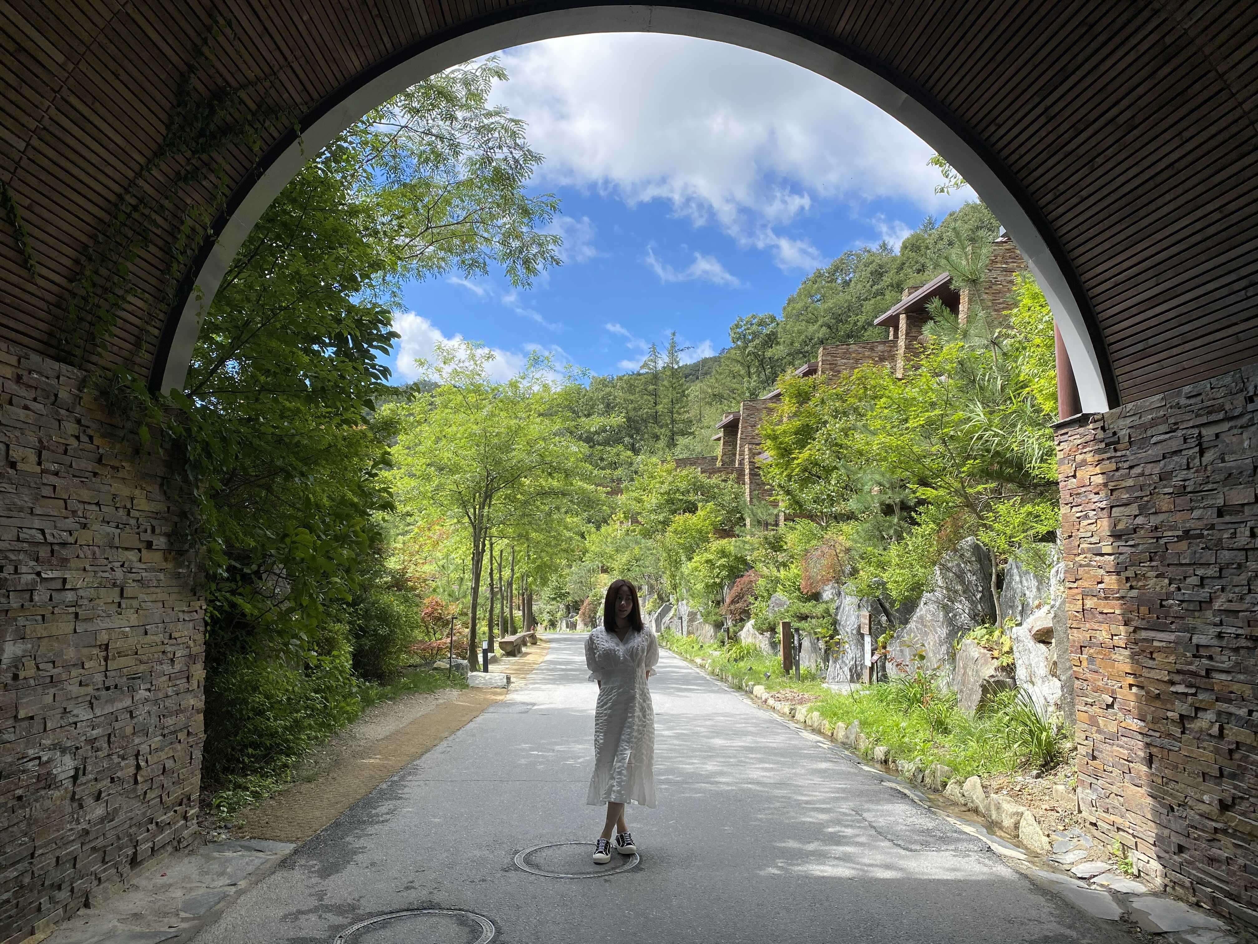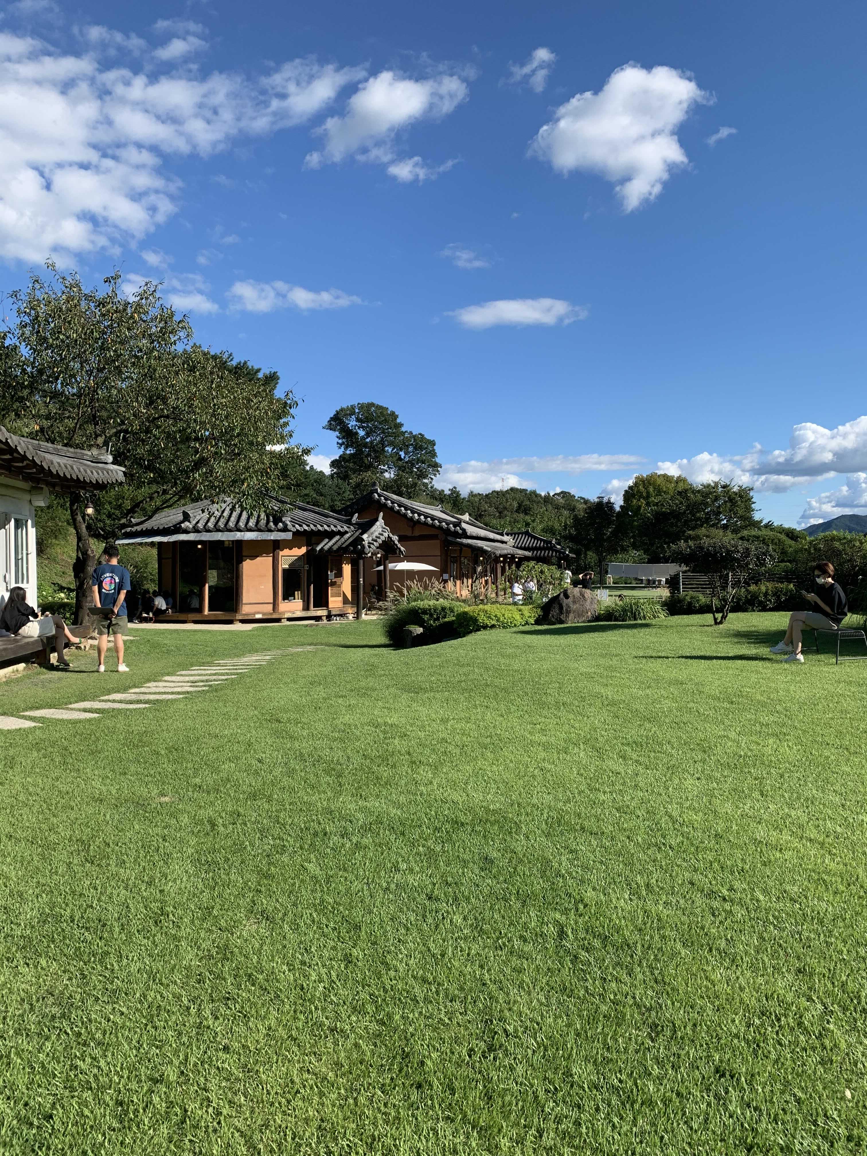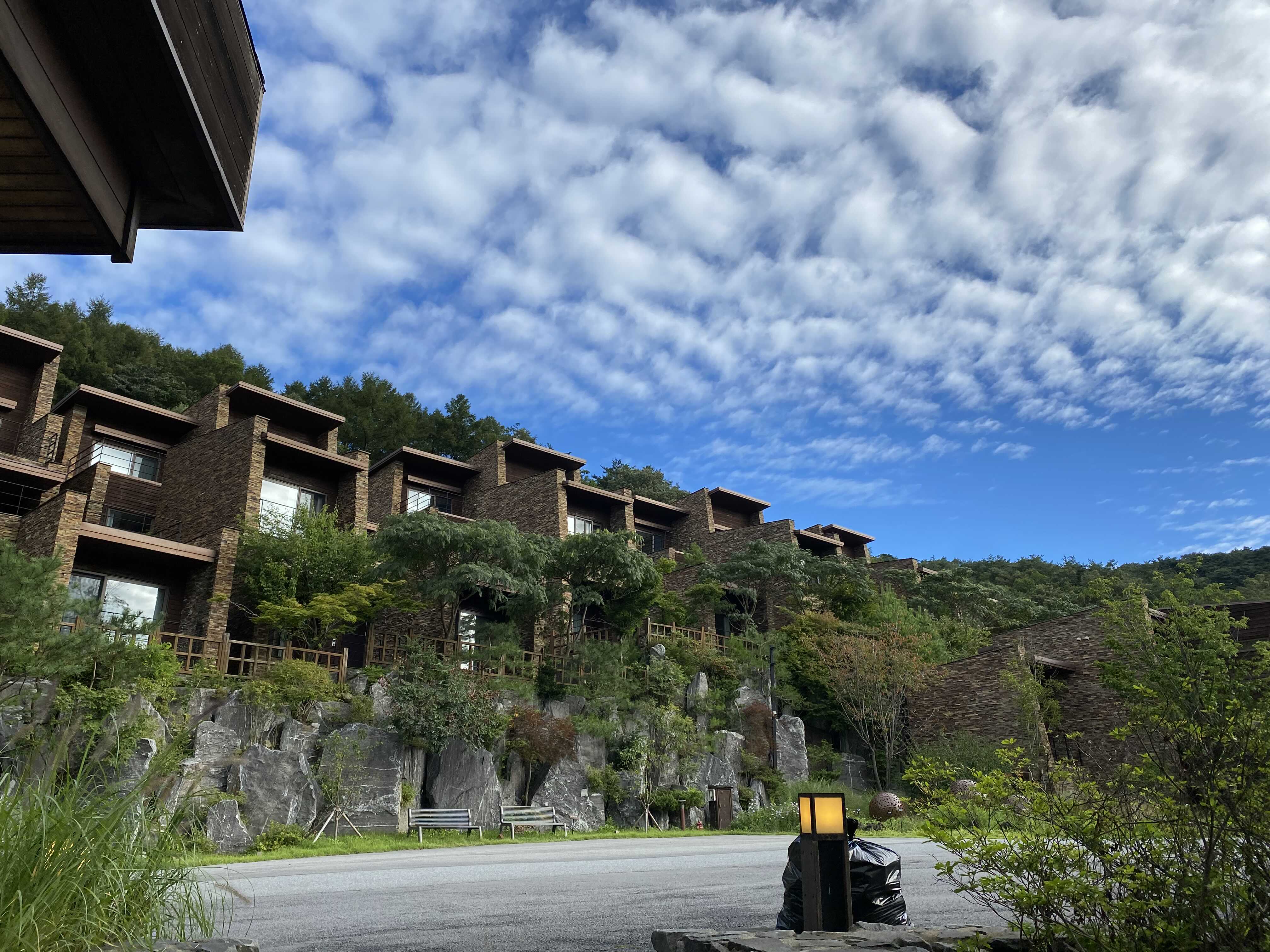 푸른하늘에 점박이 같은 구름. 그 아래 리솜 포레스트가 예쁘게 잘 어울려 있어, 조식 먹으러 가는 길 산책하면서 연신 여기 너무 이쁘다 남발했어요.
