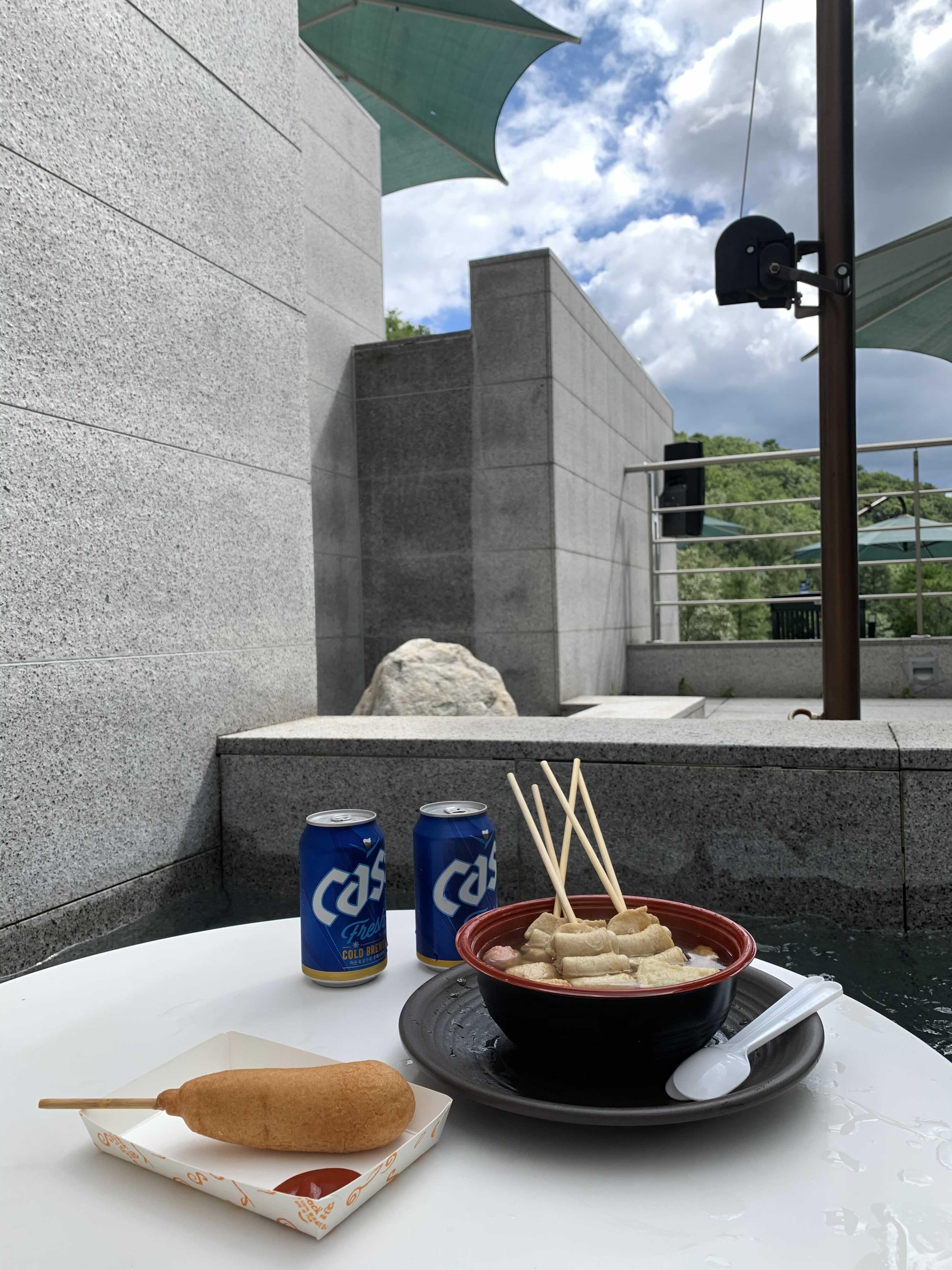 스파를 즐기고, 떠나기 전에 모듬오뎅과 핫도그, 맥주 한 캔으로 허기와 마음을 달랬어요. 잘 놀다가 갑니다.