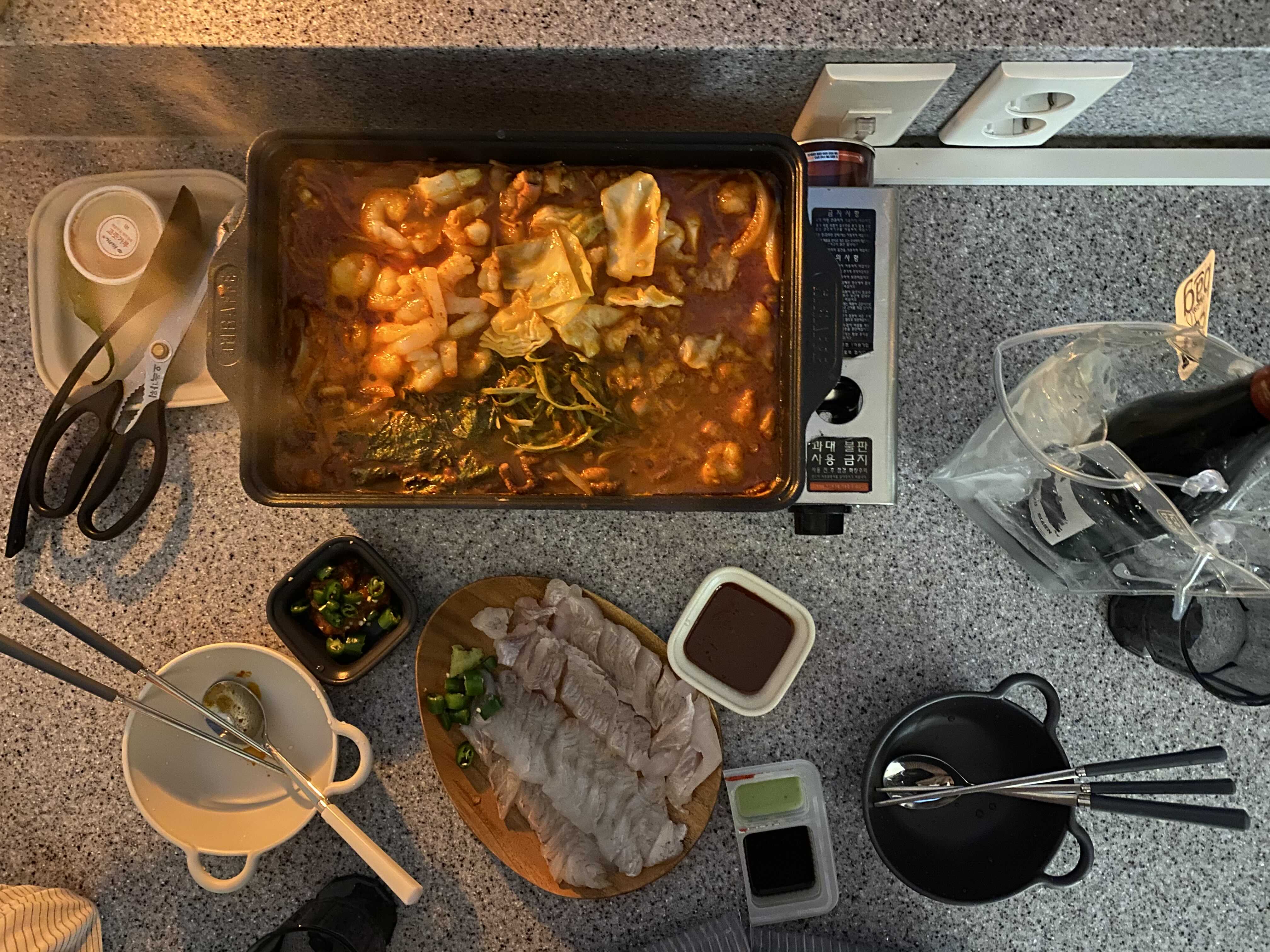 구매했다. 매운탕거리도 챙겨주시는데, 우리는 곱창전골을 먹을거라 매운탕거리는 받지않았다. 대신 사장님이 바지락을 챙겨주셔서 다음날 해장라면에 투하해서 맛있게 먹었다😋